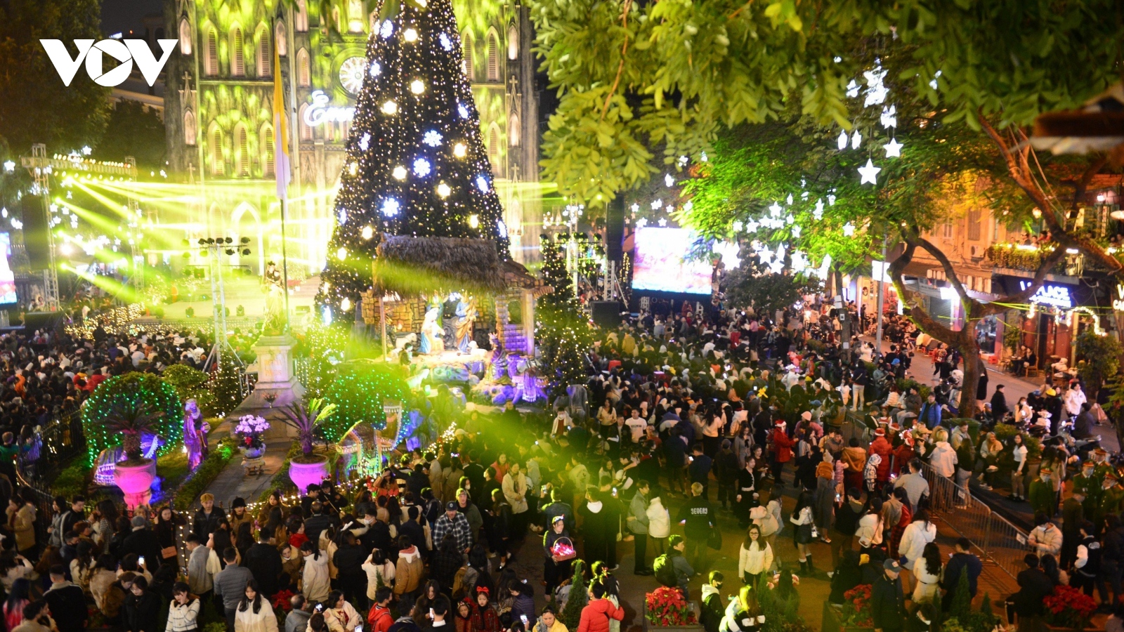 VOV.VN - Thời tiết đêm Giáng sinh năm nay ở Hà Nội không quá lạnh nên rất đông bạn trẻ, du khách và nhiều gia đình đưa con nhỏ đi chơi ở Nhà thờ Lớn...