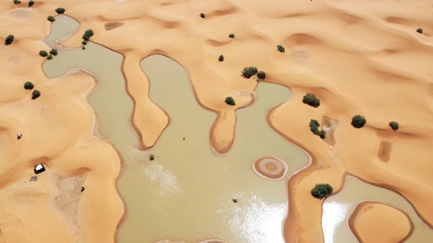 VOV.VN - Những hình ảnh ấn tượng từ sa mạc Sahara gần đây cho thấy những hồ nước lớn nằm trên những cồn cát nhấp nhô sau khi một trong những nơi khô cằn nhất thế giới phải hứng chịu trận lụt đầu tiên sau nhiều thập kỷ.
