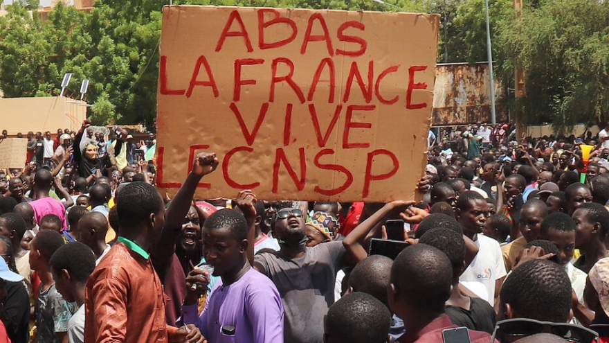 VOV.VN - Hôm qua (27/8), hàng trăm người dân Niger tiếp tục tập trung biểu tình bên ngoài căn cứ quân sự Pháp ở thủ đô Niamey để bày tỏ sự ủng hộ dành cho chính quyền quân sự, phản đối sự can thiệp và yêu cầu chấm dứt hoàn toàn sự hiện diện của quân đội Pháp tại Niger.
