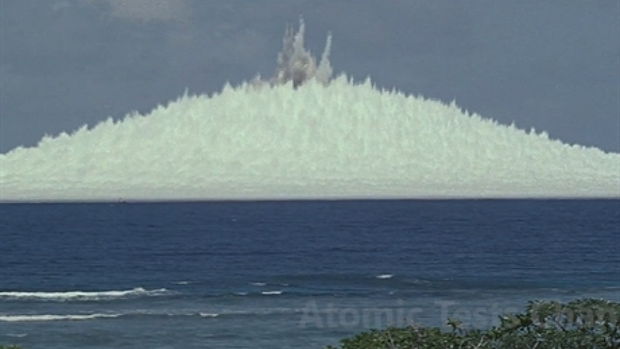 VOV.VN - Trong đoạn video, một quả bom hạt nhân Mark 7 đã phát nổ sâu dưới lòng biển, nhưng tạo ra một bức tường nước khổng lồ cao hơn 800m trong không trung.