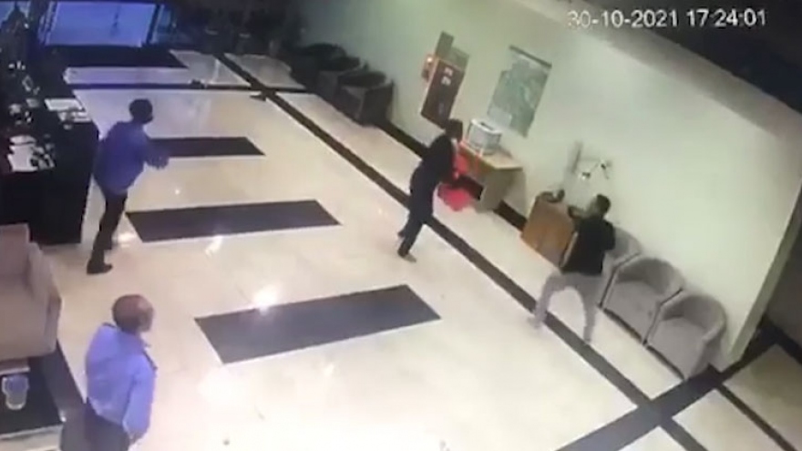 VOV.VN - Nhân viên bảo vệ một quán ăn trên phố Nguyễn Thị Định, phường Nhân Chính, quận Thanh Xuân, Hà Nội dùng hung khí chém vị khách trong lúc hai người xảy ra mâu thuẫn.