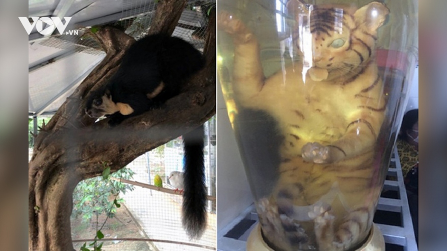 VOV.VN - Qua kiểm tra bất ngờ, lực lượng chức năng phát hiện hai cá thể gồm một con hổ đã bị ngâm trong bình rượu và một con sóc Côn Đảo đang nuôi nhốt trong một sòng bạc tại tỉnh Đồng Nai.