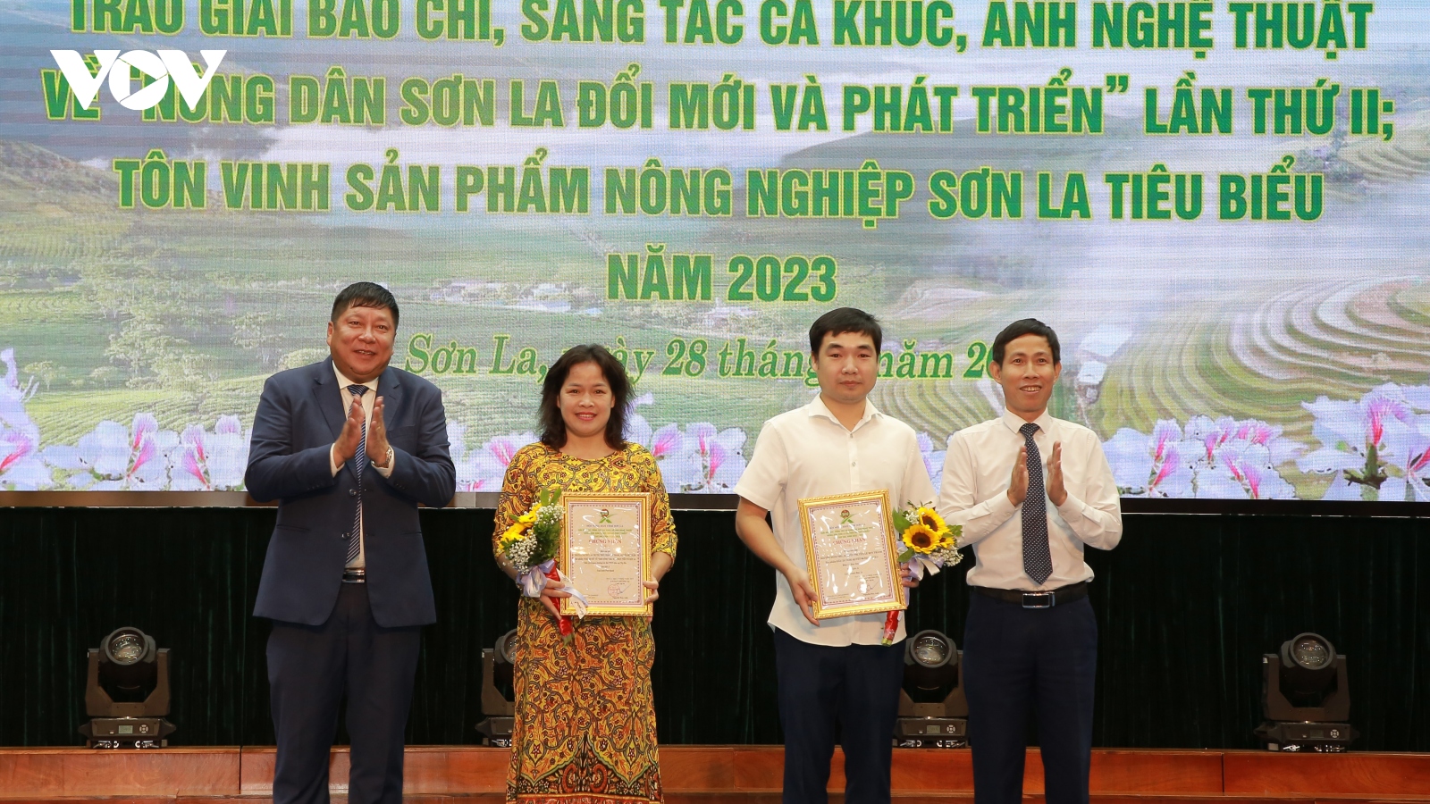 VOV.VN - Hơn 40 tác phẩm, trong đó có 22 tác phẩm báo chí đã được vinh danh tại Lễ trao giải Báo chí, sáng tác ca khúc, ảnh nghệ thuật về “Nông dân Sơn La đổi mới và phát triển” lần thứ II và tôn vinh sản phẩm nông nghiệp Sơn La tiêu biểu năm 2023. Buổi lễ do Hội Nông dân tỉnh Sơn La tổ chức chiều nay 28/9.