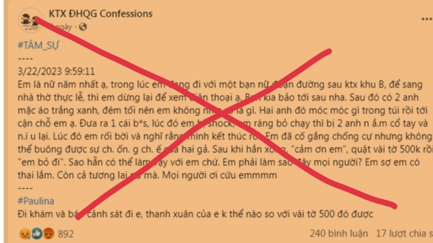VOV.VN - Thông tin nữ sinh bị hai thanh niên tấn công tình dục khi đi bộ trong khuôn viên ĐH Quốc gia TP.HCM đăng trên fanpage KTX ĐHQG Confessions là tin giả, hiện trang này đã gỡ bài.