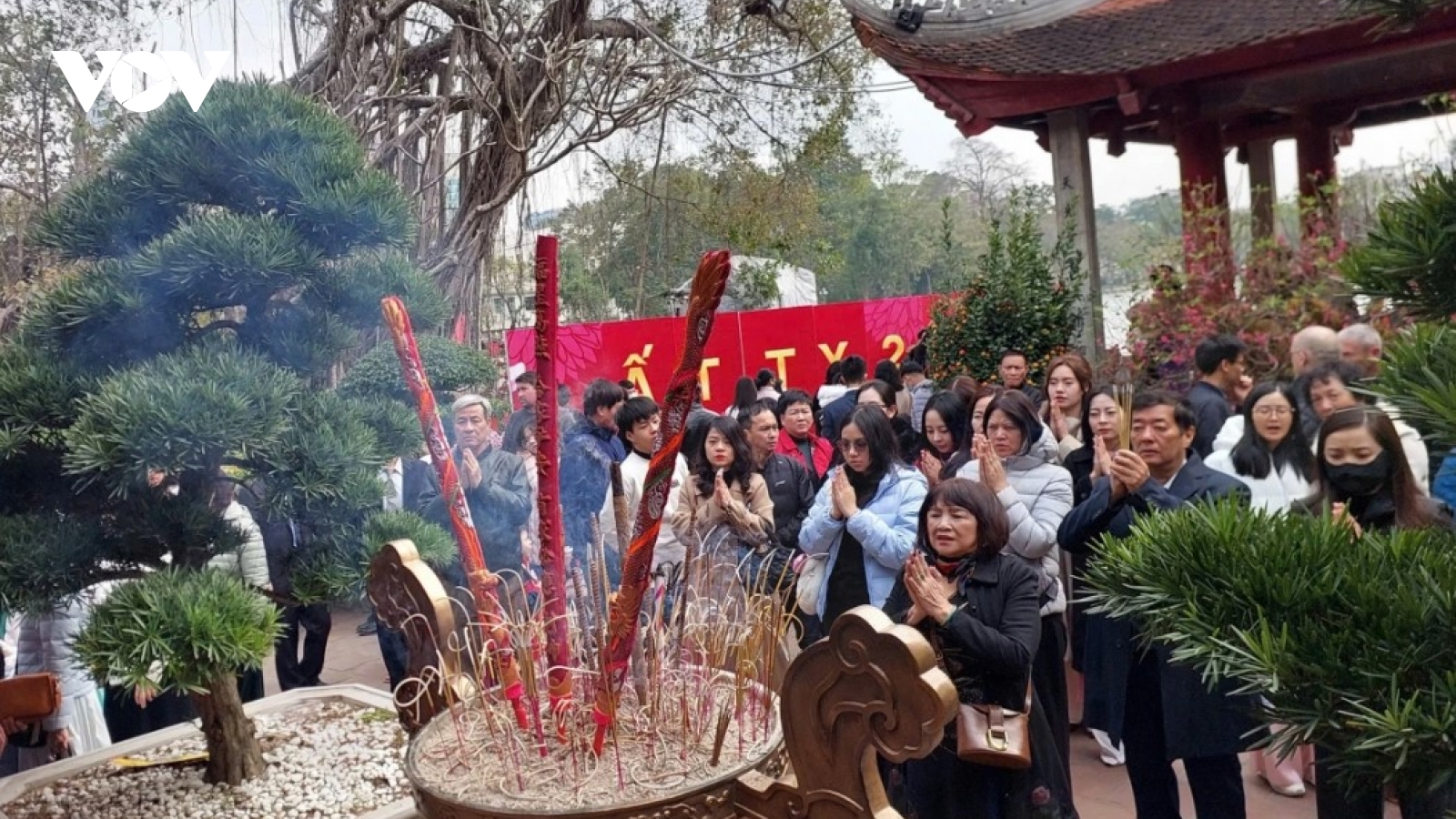 VOV.VN - Khác với không khí ồn ào, tấp nập của ngày thường, mùng 1 Tết Nguyên đán Ất Tỵ, không gian phố phường Thủ đô Hà Nội trở nên thanh bình, yên ả. Nơi thu hút đông đảo người dân Thủ đô và du khách là các ngôi đình, đền, chùa. Đến đây, mọi người đều có tâm nguyện cầu bình an, may mắn cho gia đình và người thân.