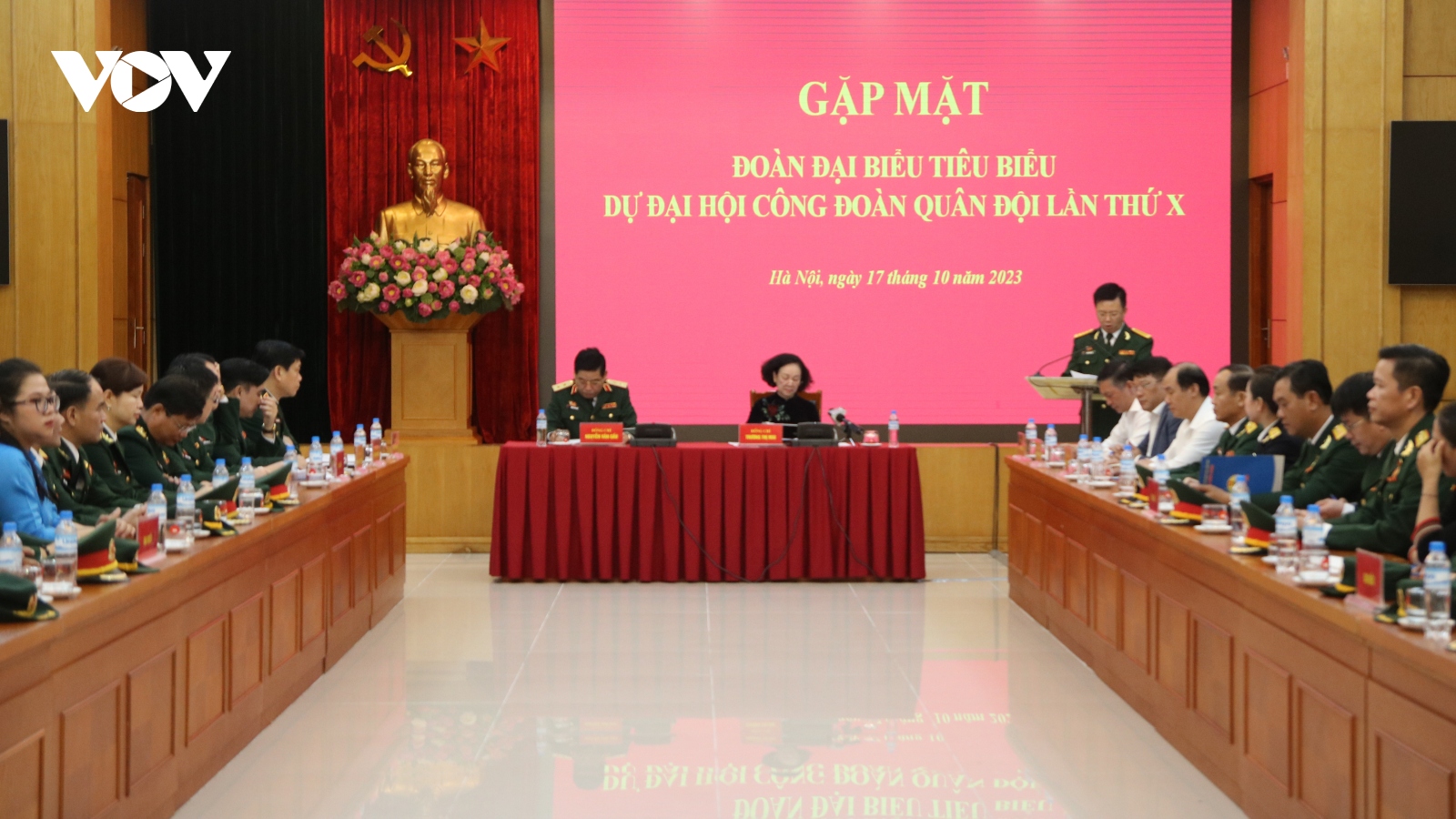 VOV.VN - Sáng nay (17/10), tại Trụ sở Văn phòng Trung ương Đảng, Uỷ viên Bộ Chính trị, Thường trực Ban Bí thư, Trưởng Ban Tổ chức Trung ương Trương Thị Mai tiếp Đoàn đại biểu là cán bộ công đoàn tiêu biểu, đại diện cho các đơn vị đầu mối trực thuộc Quân uỷ Trung ương - Bộ Quốc phòng. Cùng dự buổi tiếp có Trung tướng Nguyễn Văn Gấu, Phó Chủ nhiệm Tổng cục Chính trị- Bộ Quốc phòng.
