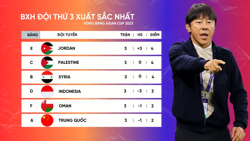 VOV.VN - Cập nhật bảng xếp hạng các đội thứ 3 có thành tích tốt nhất Asian Cup 2023, Palestine và Syria đã giành vé đi tiếp nên đẩy Indonesia vào thế khó trong việc tranh suất dự vòng 1/8.