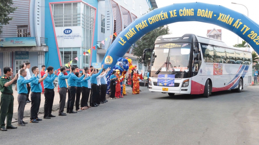 VOV.VN - Sáng 25/1 (tức 26 Tết), tại Bình Dương, không khí Tết trở nên ấm áp hơn bao giờ hết khi hàng nghìn công nhân được lên chuyến xe 0 đồng về quê đón Tết cùng gia đình.
