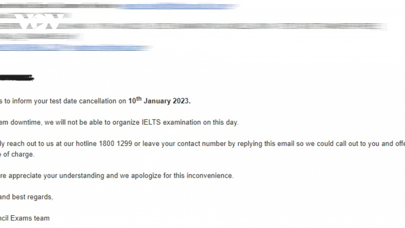 VOV.VN - Chiều qua (6/1), nhiều thí sinh đăng ký tham dự kỳ thi IELTS tại Hội đồng Anh bất ngờ nhận được thông báo về việc hoãn kỳ thi IELTS ngày 10/1.