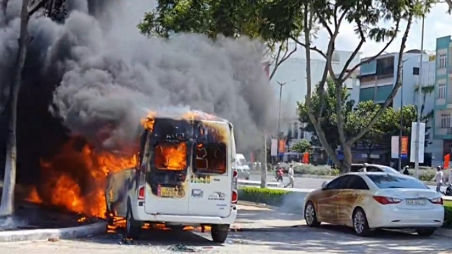 VOV.VN - Trưa nay (4/9), trên đường 2/9, quận Hải Châu, thành phố Đà Nẵng xảy ra vụ cháy 2 xe ô tô 16 chỗ đang đậu gần nhau. Vụ cháy không gây thiệt hại về người nhưng cả 2 xe bị lửa thiêu rụi.
