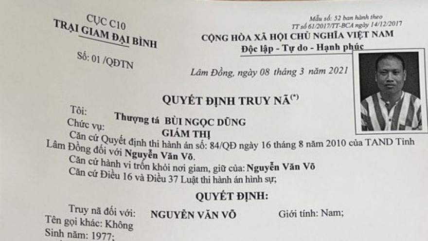 VOV.VN - Ngày 9/3, Công an tỉnh Lâm Đồng cho biết, đang tích cực phối hợp với các đơn vị liên quan truy tìm một phạm nhân vừa bỏ trốn khỏi trại giam Đại Bình (thuộc Cục C10 - Bộ Công an).
