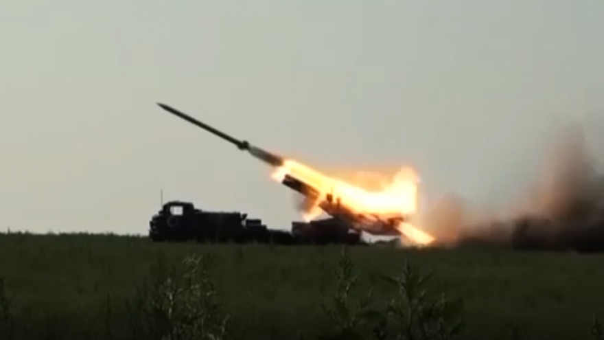 VOV.VN - Đoạn video được Bộ Quốc phòng Nga công bố ngày 16/8 cho thấy pháo phản lực phóng loạt Uragan khai hỏa trong chiến dịch quân sự ở Ukraine. Vị trí triển khai không được tiết lộ.