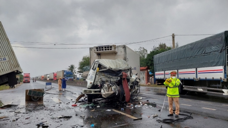 VOV.VN - Hai xe tải va chạm trực diện làm biến dạng phần cabin, tài xế thoát chết trong gang tấc. Quốc lộ 1A đoạn qua địa bàn xã Quảng Hưng, huyện Quảng Trạch, tỉnh Quảng Bình tắc nghẽn trong nhiều giờ.