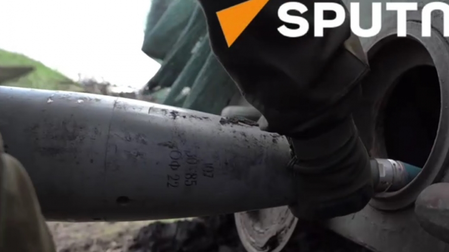 VOV.VN - Lính pháo binh Nga nạp đạn pháo vào cỗ pháo tự hành được phủ lá và lưới ngụy trang. Từ công sự, pháo nã từng phát đạn vang rền vào mục tiêu. Thiết bị quan sát của Nga (có lẽ là loại hồng ngoại đặt trên UAV) đã ghi lại cảnh đầu đạn nổ tại mục tiêu.