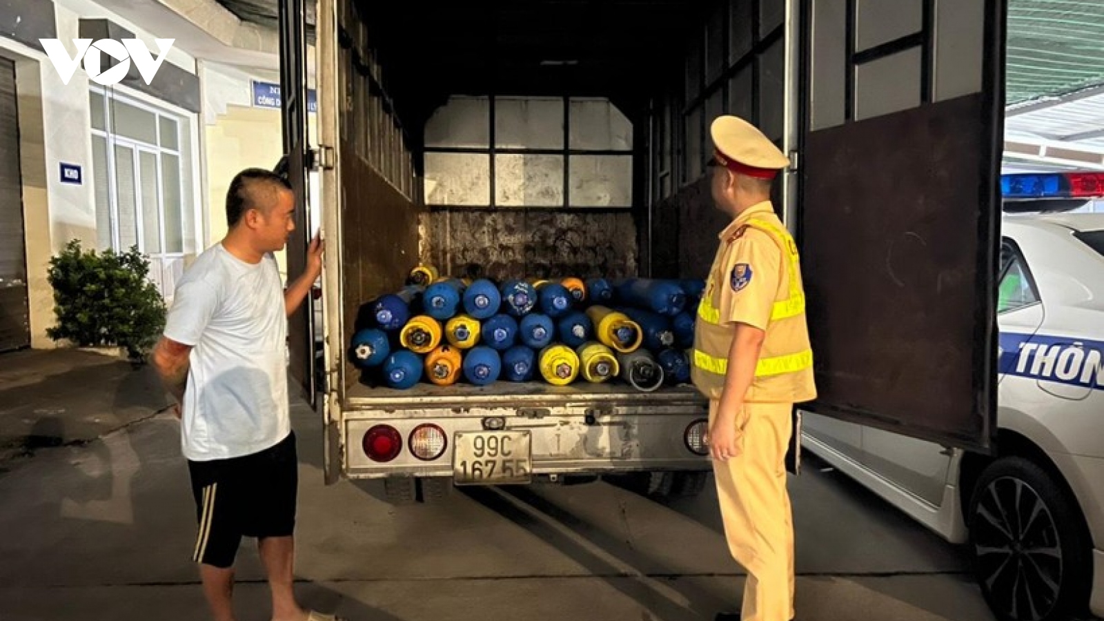 VOV.VN - Tổ công tác của Đội Cảnh sát giao thông số 2, Phòng Cảnh sát giao thông đường bộ - đường sắt, Công an tỉnh Quảng Ninh vừa phát hiện xe tải chở gần 90 bình khí cười không rõ nguồn gốc.