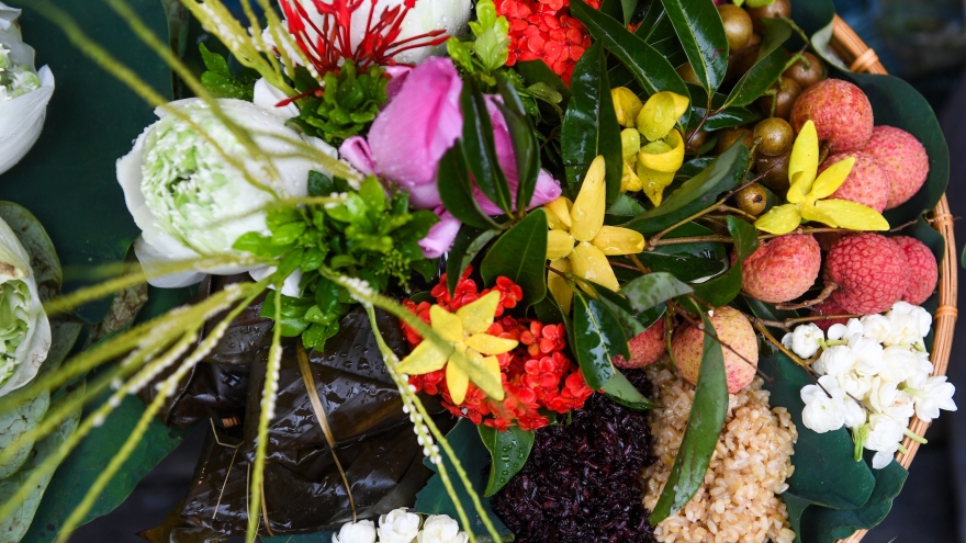 Ngoài rượu nếp, mận hay bánh gio, nhiều tiểu thương ở chợ Hàng Bè (Hà Nội) còn sắp sẵn và bày biện đẹp đẽ những mâm lễ để phục vụ khách mua về cúng Tết Đoan Ngọ với giá 600.000 đồng.