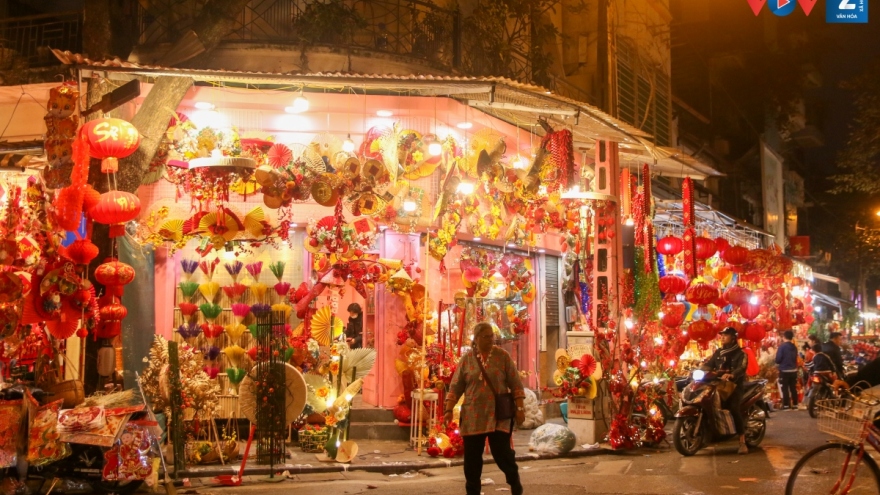 VOV.VN - Phố Hàng Mã (Hoàn Kiến, Hà Nội) những ngày này rực rỡ sắc đỏ, phong phú các mặt hàng câu đối Tết, đèn lồng, tràng pháo trang trí…, phục vụ người dân Thủ đô mua sắm, đón Tết nguyên đán Quý Mão 2023.