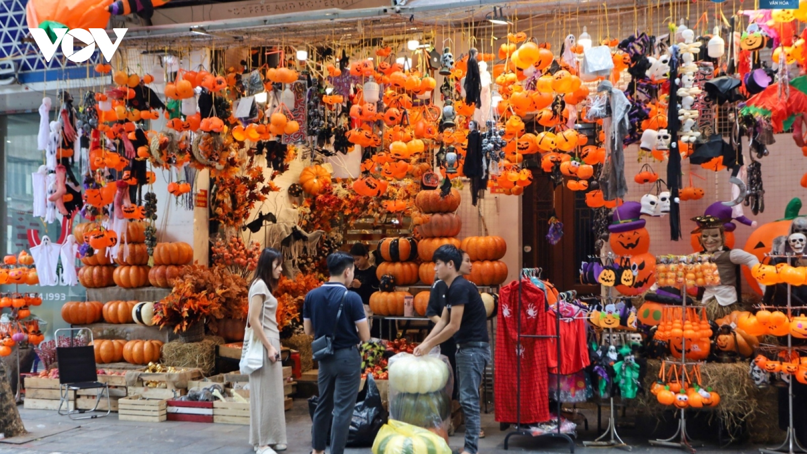 VOV.VN - Đồ hóa trang phù thủy, hình nộm, nón phù thuỷ, lưỡi hái hay giỏ đựng kẹo bí ngô đang là những món hàng được săn đón tại Hàng Mã (Hoàn Kiếm, Hà Nội) trong mùa Halloween này.