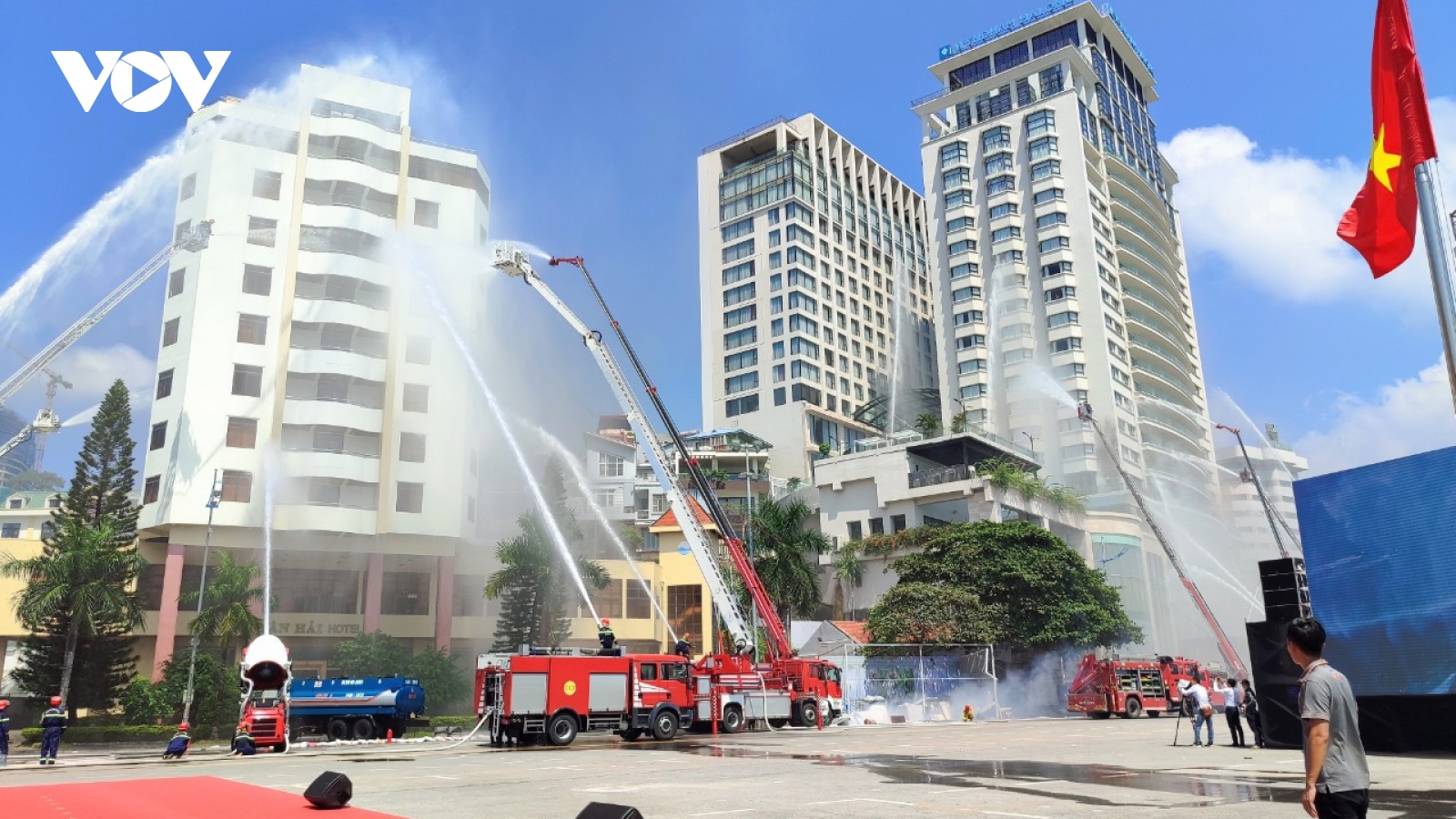 VOV.VN - Trực thăng, robot, siêu xe chữa cháy, flycam, cano... cùng trên 2.000 người đã tham gia diễn tập tiếp cận đám cháy, tìm kiếm cứu nạn cứu hộ những người mắc kẹt trên các tàu du lịch, tầng cao của khách sạn thuộc thành phố Hạ Long (Quảng Ninh).