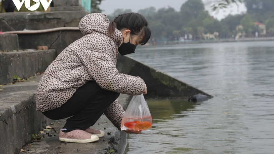 VOV.VN - Ngay từ sáng sớm, người dân đã đến các địa điểm quen thuộc ở Hà Nội như Hồ Tây, cầu Long Biên… để thả cá tiễn ông Công, ông Táo về Trời. Phần lớn người dân đã làm lễ từ ngày thứ Bảy, Chủ Nhật (ngày 20, 21 Âm lịch) nên ngày chính lễ hôm nay lượng người đi phóng sinh ít hơn.