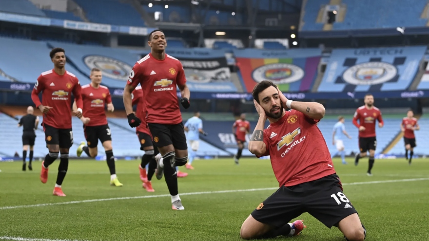 VOV.VN - Hai bàn thắng của Bruno (2') và Shaw (50') giúp MU "kéo sập" thành trì Etihad trong trận derby Manchester thứ 185 ở vòng 27 Ngoại hạng Anh 2020/2021, qua đó chấm dứt chuỗi 21 trận toàn thắng của Man City.