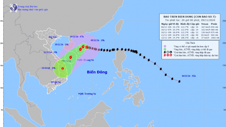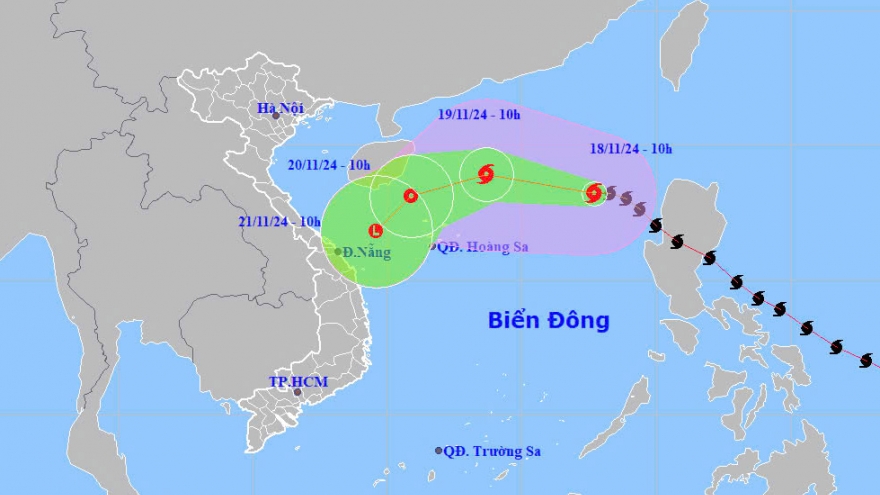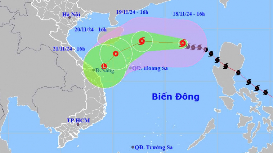 VOV.VN - Theo Trung tâm dự báo khí tượng thủy văn, tính đến 19 giờ ngày 18/11, sức gió mạnh nhất vùng gần tâm bão mạnh cấp 11 (103-117km/h), giật cấp 14. Di chuyển theo hướng Tây Tây Bắc, tốc độ khoảng 20km/h.
