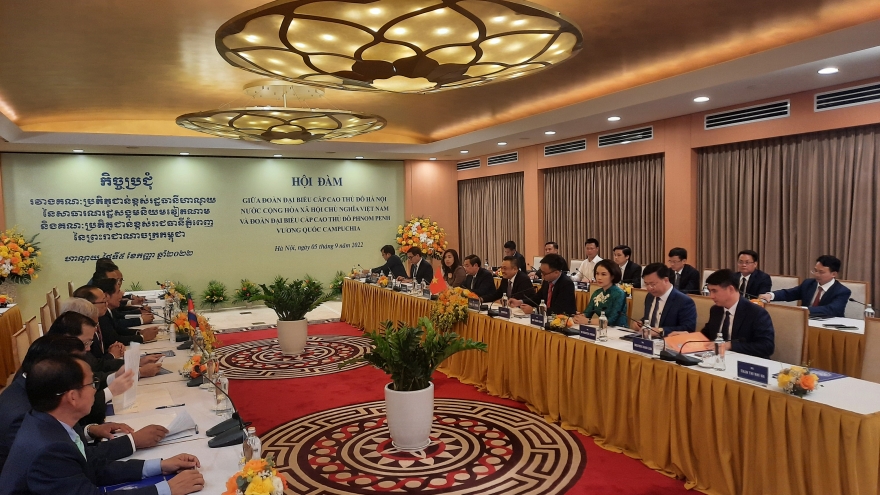 VOV.VN - Trong khuôn khổ chuyến thăm Thủ đô Hà Nội từ ngày 4/9 đến ngày 6/9, chiều nay, Đoàn đại biểu cấp cao Thủ đô Phnom Penh (Vương quốc Campuchia) do Ngài Khuong Sreng - Đô trưởng dẫn đầu đã có cuộc Hội đàm với đoàn đại biểu cấp cao Thủ đô Hà Nội.