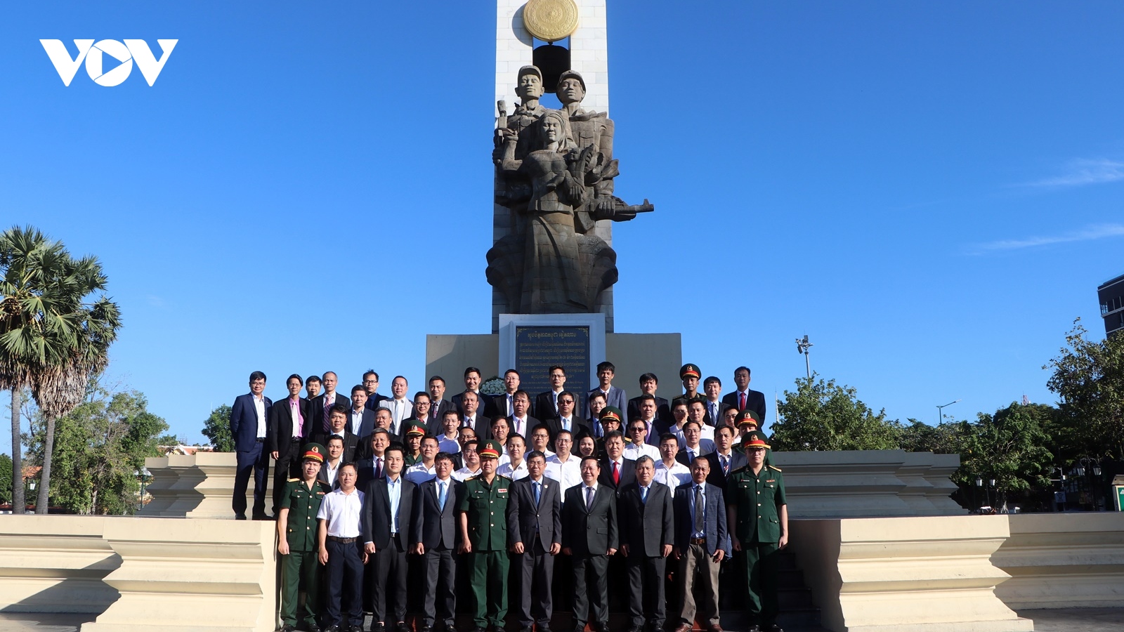 VOV.VN - Nhân 79 năm Ngày thành lập Quân đội nhân dân Việt Nam và 34 năm Ngày hội Quốc phòng toàn dân, cơ quan Tùy viên quốc phòng Việt Nam tại Campuchia phối hợp cùng Đại sứ quán Việt Nam và các cơ quan đại diện Việt Nam tại Campuchia tổ chức dâng hoa, dâng hương tại tượng đài Hữu nghị Việt Nam - Campuchia ở Phnom Penh.