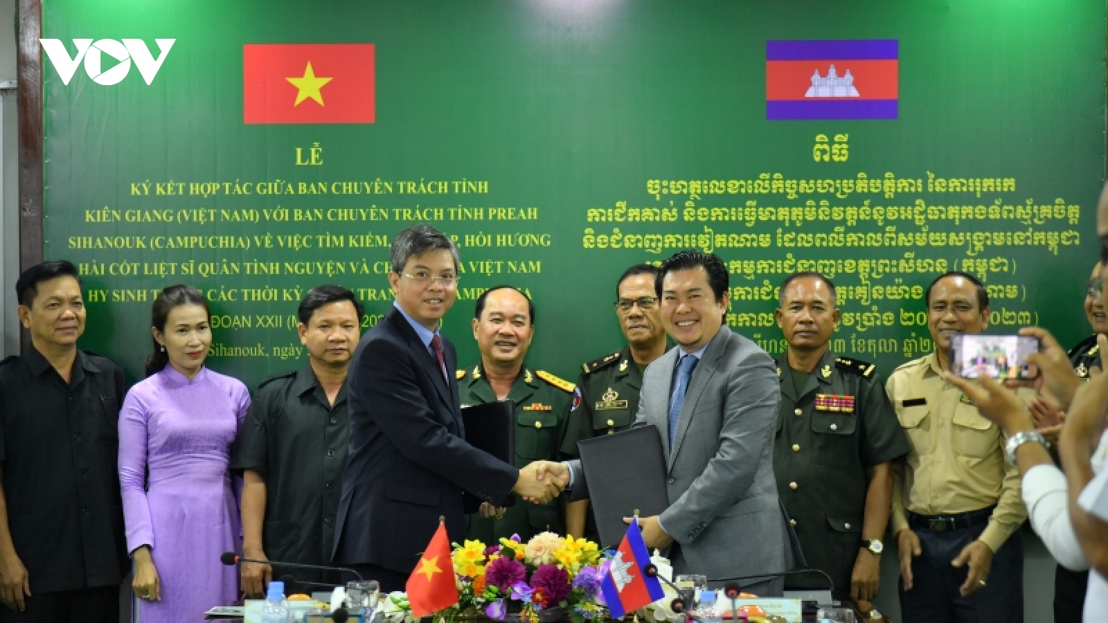 VOV.VN - Đoàn cán bộ Ban Chuyên trách tỉnh Kiên Giang và Ban Chuyên trách tỉnh Preah Shihanouk, Vương quốc Campuchia vừa ký kết hợp tác tìm kiếm, quy tập, hồi hương hài cốt liệt sĩ quân tình nguyện và chuyên gia Việt Nam hy sinh trong các thời kỳ chiến tranh tại Campuchia, giai đoạn XXII (mùa khô 2022 - 2023).