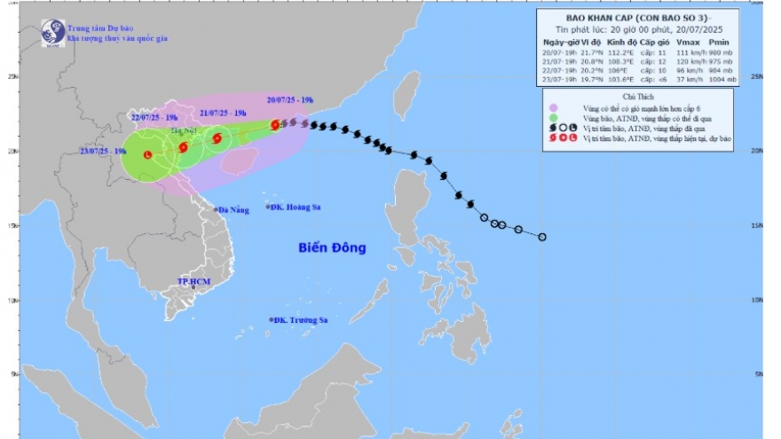 VOV.VN - Hồi 19h ngày 20/7, tâm bão ở khoảng 21,7°N; 112,2°E, trên vùng biển phía Tây Bắc khu vực Bắc Biển Đông, cách Quảng Ninh – Hải Phòng khoảng 480km về phía Đông. Sức gió mạnh nhất cấp 11 (103–117km/h), giật cấp 14. Bão di chuyển theo hướng Tây, tốc độ khoảng 20km/h.