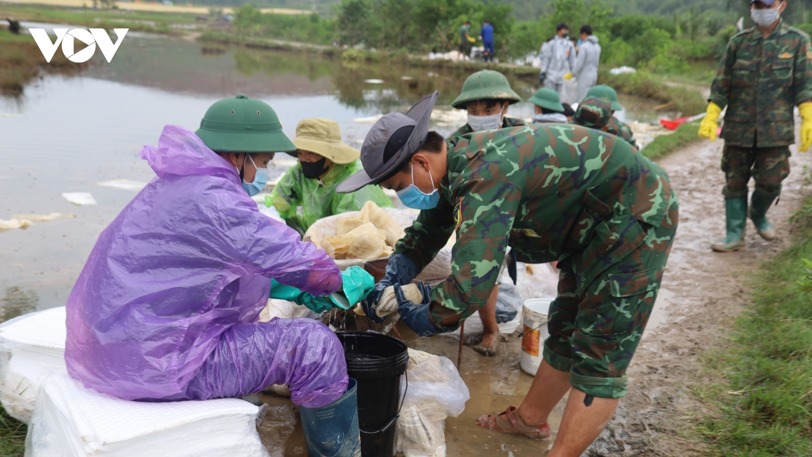 VOV.VN - Sự cố tràn dầu ra môi trường ở xã Vạn Tường, thuộc khu kinh tế Dung Quất, tỉnh Quảng Ngãi ảnh hưởng đến môi trường tự nhiên. Lực lượng chức năng tỉnh Quảng Ngãi đang tập trung thu gom số dầu tràn ra môi trường.