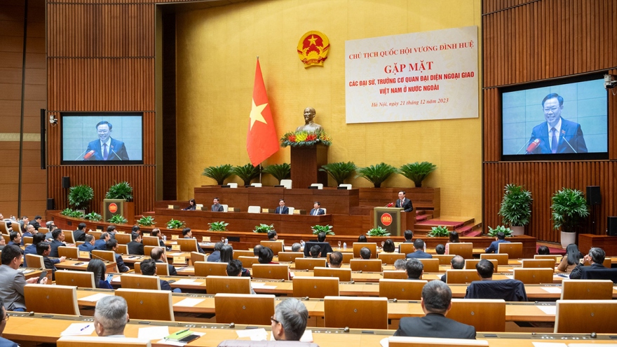 VOV.VN - Trong khuôn khổ Hội nghị Ngoại giao lần thứ 32, chiều tối 21/12, tại Nhà Quốc hội, Chủ tịch Quốc hội Vương Đình Huệ đã tiếp và làm việc với Đoàn Trưởng các cơ quan đại diện Việt Nam ở nước ngoài, do Bộ trưởng Bộ Ngoại giao Bùi Thanh Sơn dẫn đầu.