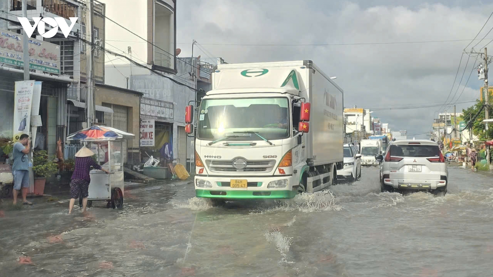 VOV.VN - Những ngày qua, triều cường dâng cao có lúc đỉnh triều ở mức báo động 3 (2,2 m) khiến tuyến Quốc lộ 1A qua tỉnh Cà Mau nhiều đoạn bị ngập sâu, gây khó khăn cho người dân trong việc lưu thông.