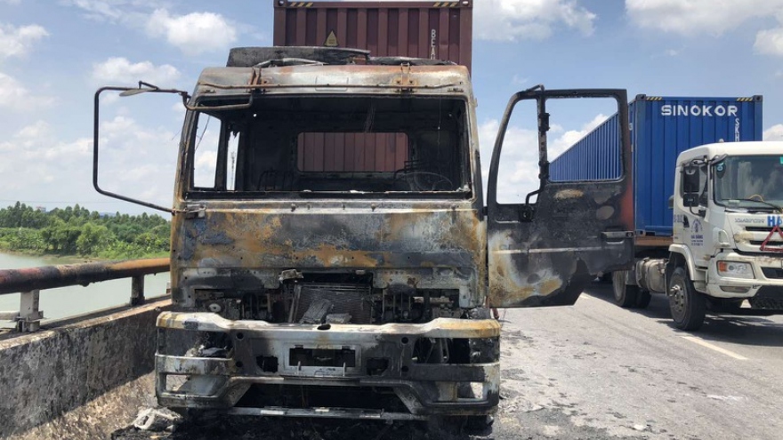 Xe container bốc cháy giữa cầu, tài xế hoảng loạn dập lửa bất thànhVOV.VN - Trưa 20/5, tại Km60+200, quốc lộ 5, đoạn chạy qua phường Ái Quốc, thành phố Hải Dương xảy ra một vụ cháy xe đầu kéo container.