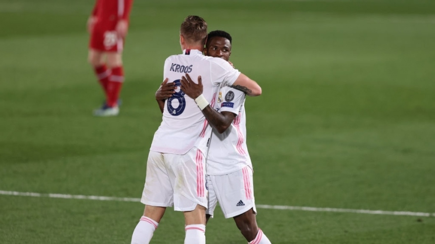 VOV.VN - Kroos có đường kiến tạo ở đẳng cấp rất cao để Vinicius ghi bàn mở tỉ số giúp Real Madrid đánh bại Liverpool với tỉ số 3-1 ở trận tứ kết lượt đi Champions League 2020/2021.
