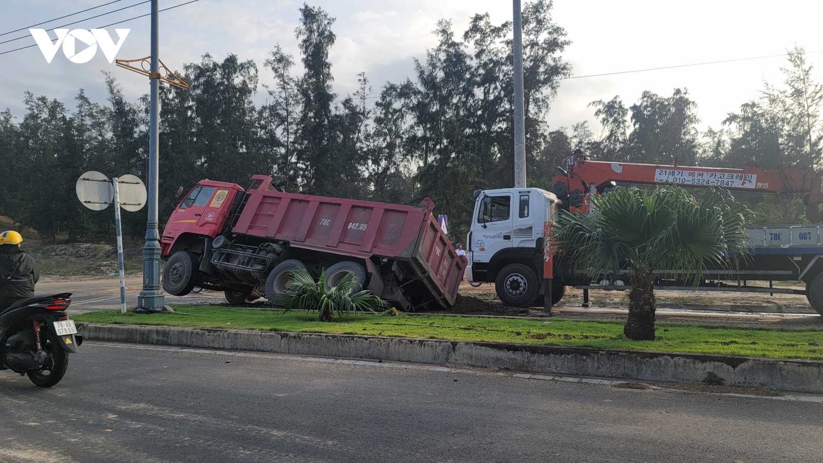 VOV.VN - Xe tải đang chạy trên đường Lê Duẩn, thành phố Tuy Hòa, tỉnh Phú Yên thì bất ngờ mặt đường sụp lún khiến phương tiện sụp hố. Nguyên nhân được xác định do ống nước rò rỉ.