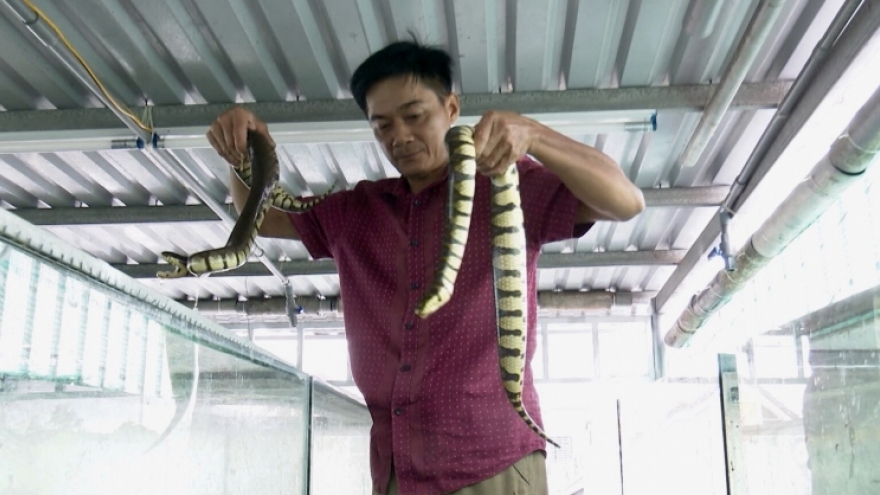 VOV.VN - Rắn ri voi thường được bà con huyện Phụng Hiệp, tỉnh Hậu Giang nơi đây nuôi trong vèo, ao, mương, xô chậu hay bể xi măng. Tuy nhiên gần đây có một hộ dân đã đem loài vật này nuôi trong lồng kính đặt trên tầng 3 ngôi nhà đang ở và mô hình này đã mang lại hiệu quả kinh tế rất cao.