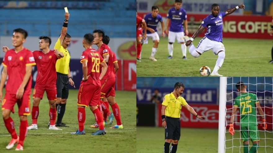 VOV.VN - Các cầu thủ Thanh Hóa phản ứng dữ dội khi thổi penalty cho Hà Nội FC nhưng Rimario lại khiến sân Hàng Đẫy chết lặng với màn chạy đà phức tạp và cú sút 11m hỏng.