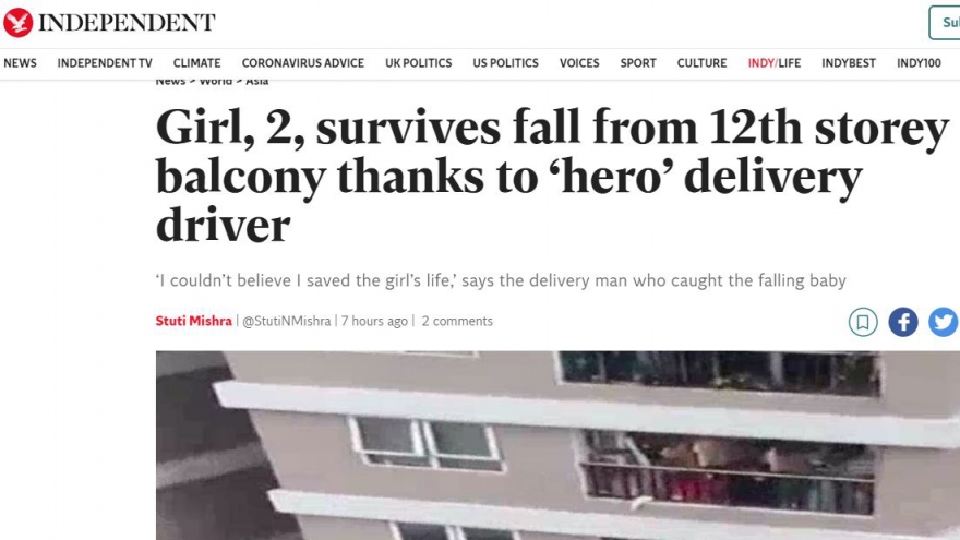 VOV.VN - Các trang báo Anh như Independent và Daily Mail đều ca ngợi anh Nguyễn Ngọc Mạnh là một “người hùng” sau khi cứu bé gái 3 tuổi rơi từ tầng 12 của một tòa nhà ở Hà Nội.