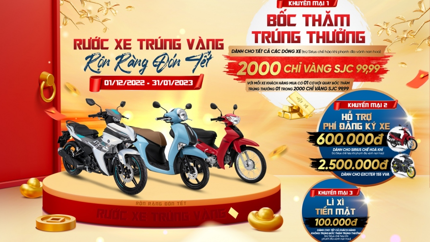 VOV.VN - Chỉ cần mua xe Yamaha với chương trình ưu đãi “Rước xe trúng vàng, rộn ràng đón Tết", từ ngày 1/12/2022 đến hết ngày 31/01/2023, khách hàng sẽ có cơ hội nhận được nhiều ưu đãi vô cùng hấp dẫn đến từ nhà sản xuất xe hàng đầu Nhật Bản.