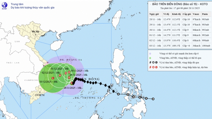 VOV.VN - Theo Trung tâm dự báo khí tượng thủy văn quốc gia, hồi 16 giờ ngày 28/11, vị trí tâm bão số 15 ở vào khoảng 12,4 độ Vĩ Bắc; 112,6 độ Kinh Đông, cách đảo Song Tử Tây khoảng 195km về phía Tây Bắc.