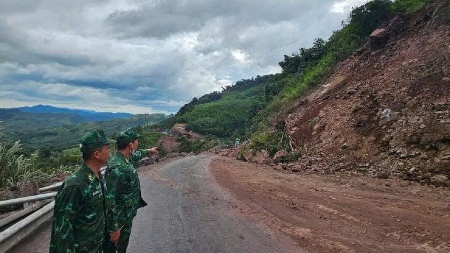 VOV.VN - Sạt lở đất khi thi công mở rộng một khúc cua tại quốc lộ 15D khiến đường lên Cửa khẩu quốc tế La Lay (Quảng Trị) bị ách tắc, lực lượng chức năng đang khắc phục.