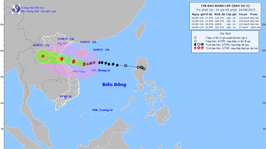 VOV.VN - Bản tin cập nhật lúc 14h, vị trí tâm bão số 5 ở khoảng 17,4 độ Vĩ Bắc – 110,3 độ Kinh Đông, trên vùng biển phía Tây Bắc quần đảo Hoàng Sa; cách Nghệ An khoảng 520km, cách Hà Tĩnh 500km và cách Bắc Quảng Trị 430km.