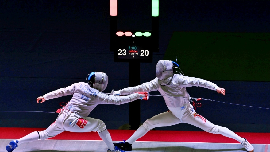 VOV.VN - Ngày 18/5, tại Cung điền kinh trong nhà Mỹ Đình (Hà Nội) diễn ra những nội dung cuối cùng của môn đấu kiếm SEA Games 31. Đội tuyển đấu kiếm Việt Nam đã xuất sắc giành thêm tấm huy chương vàng ở nội dung kiếm chém đồng đội nữ.