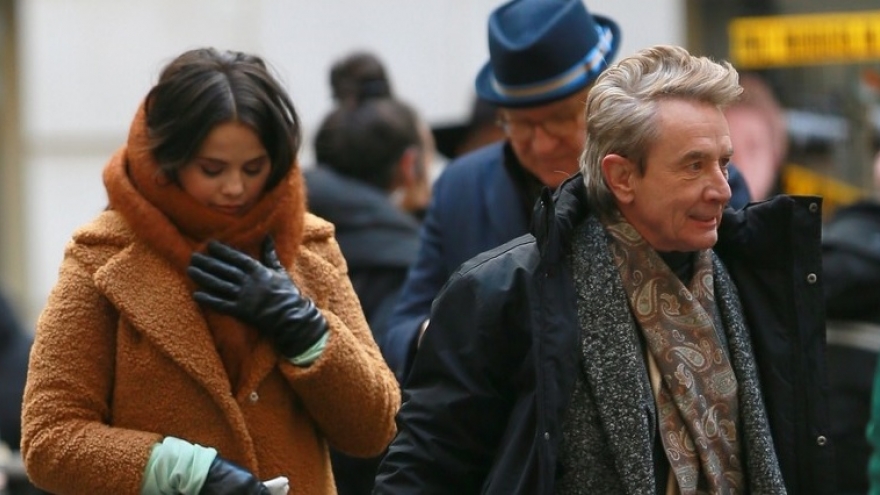 VOV.VN - Selena Gomez trang điểm nhẹ nhàng, diện đồ ấm áp, để lộ thân hình ngày càng tăng cân trên phim trường bộ phim "Only Murderers in the building" phần 2.