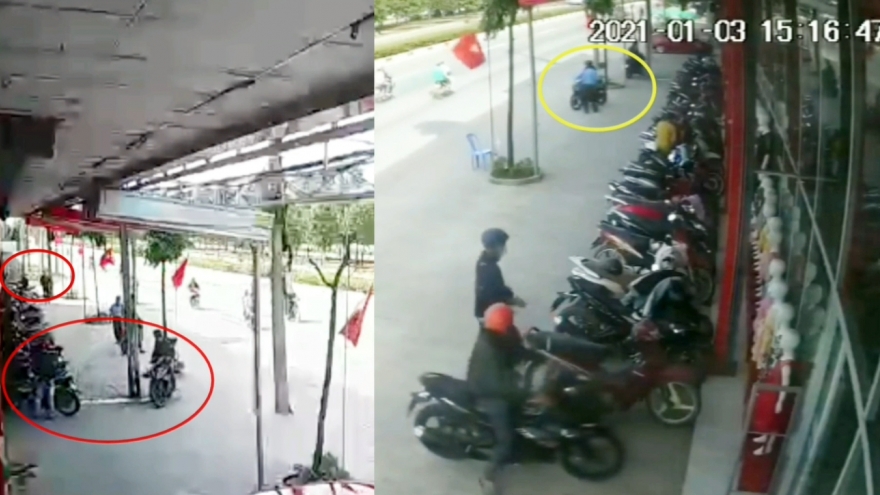 VOV.VN - Sáng 5/1, mạng xã hội lan truyền một đoạn video từ camera an ninh của shop quần áo tại phường Khánh Bình, thị xã Tân Uyên, tỉnh Bình Dương về thủ đoạn dàn cảnh trộm cướp xe máy của nhóm thanh niên trước mặt bảo vệ.