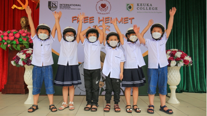 VOV.VN - Các sinh viên Trường Quốc tế thuộc ĐHQG Hà Nội vừa trao tặng 400 mũ bảo hiểm cho học sinh tiểu học và 30 suất quà dành cho các em nhỏ có hoàn cảnh khó khăn tại Đan Phượng, Hà Nội