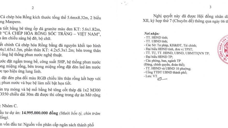 VOV.VN - TP Sóc Trăng dự kiến lắp đặt 2 tượng cá chép hóa rồng tại 2 bên bờ kè sông Maspero với tổng đầu gần 15 tỷ đồng, lấy từ nguồn vốn phân cấp ngân sách thành phố.