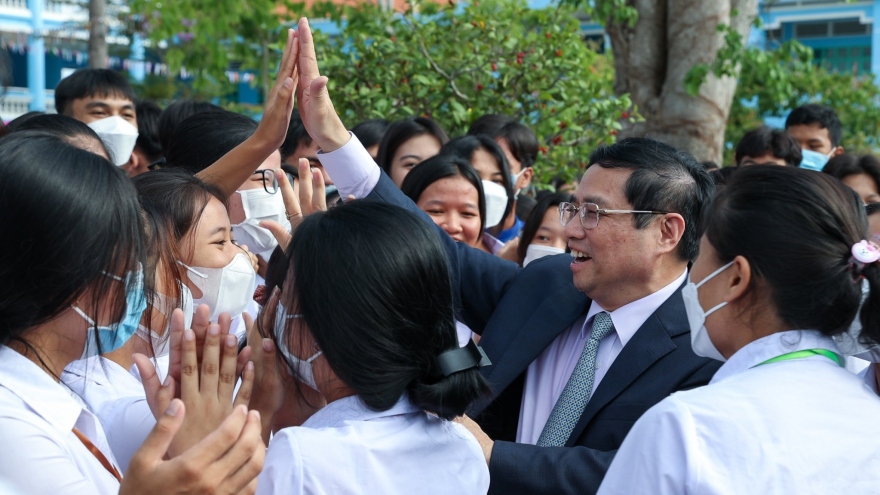 VOV.VN - Sáng 28/4, tiếp tục chương trình công tác tại Sóc Trăng, Thủ tướng Phạm Minh Chính và đoàn công tác đã tới thăm, động viên các giáo viên, học sinh Trường phổ thông Dân tộc nội trú Huỳnh Cương tại TP. Sóc Trăng.