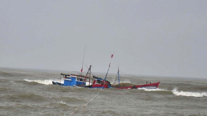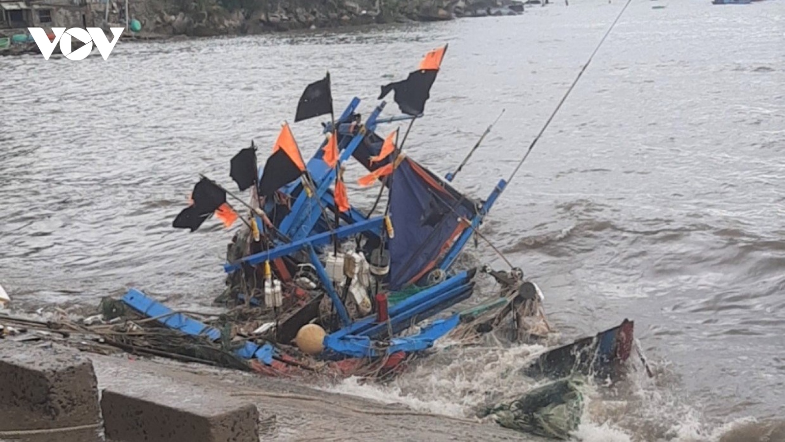 VOV.VN - Khi tàu đánh cá đang vận chuyển ốc vào bờ, cách cầu cảng Bãi Nhà khoảng 500m thì bị sóng lớn đánh chìm, các thuyền viên trên tàu kịp nhảy xuống biển thoát thân.